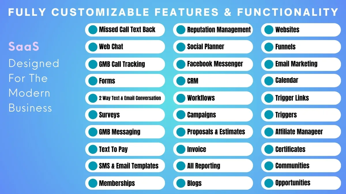 Build forms and funnel pages to capture leads, user automated sms, email, phone calls, voicemails, and Facebook Messages to nurture leads through custom pipelines, converse with leads & clients via text, phone, and Facebook Messenger (all in one stream!), and more!